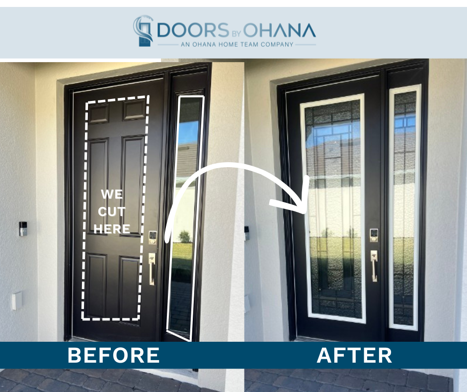 Side-by-side comparison of a front door before and after installation of a custom glass insert by Doors by Ohana
