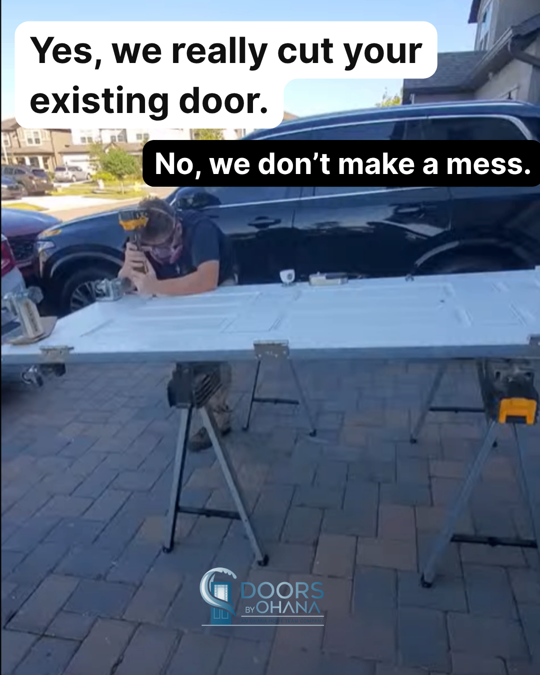 - The Extraction: We carefully remove your door from its hinges and place it on professional sawhorses, usually right in your driveway or garage.